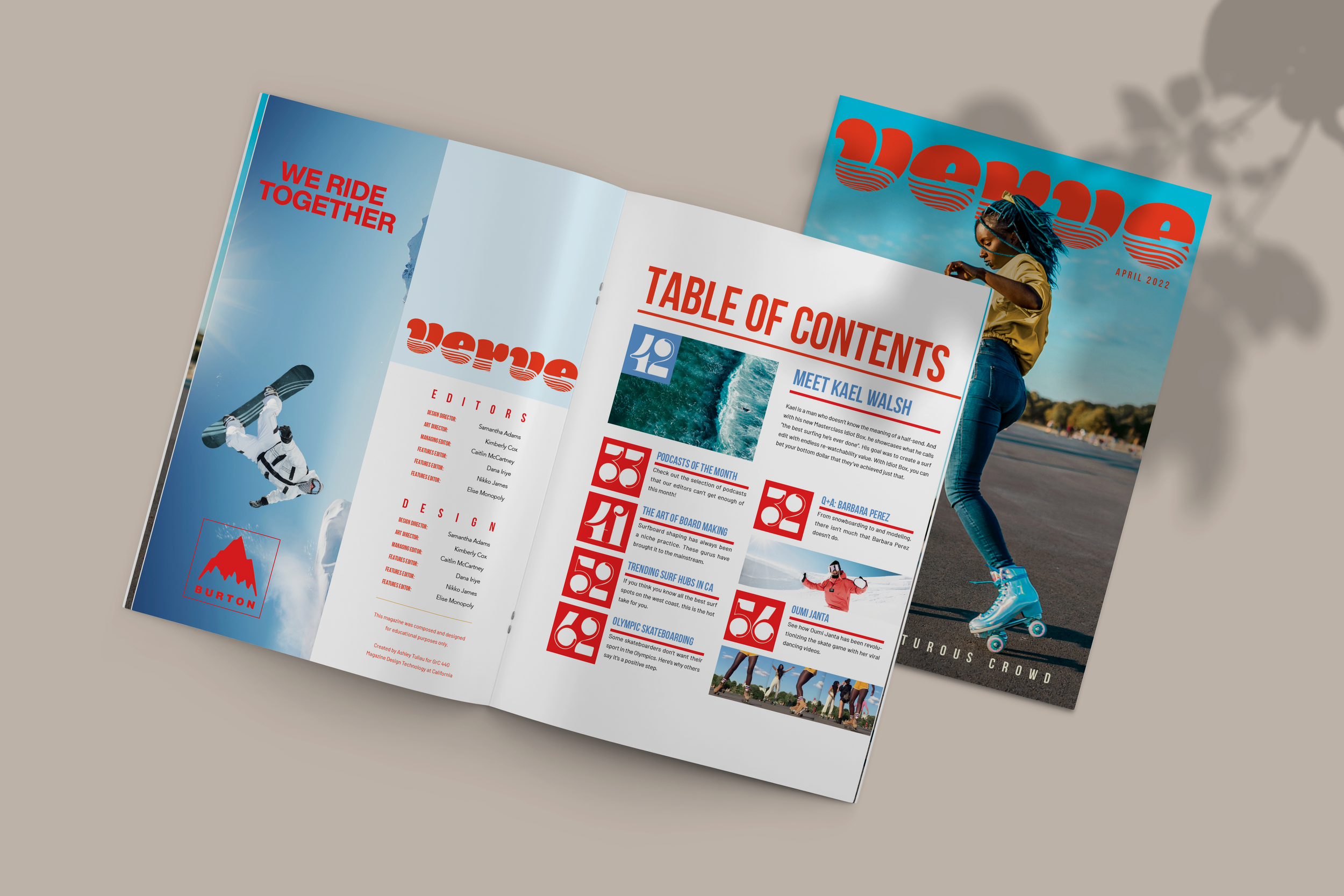 I was tasked with conceptualizing, designing, and producing a magazine sample for my Magazine Design Technology class at Cal Poly. I designed a women’s outdoor sports magazine portrayed through a pop culture lens that placed women’s sports in the mainstream media. My goal was to spark conversation about how social media, current events, and technology have influenced female sports. We conducted multiple in-depth reviews of the concept, copy, and layout.